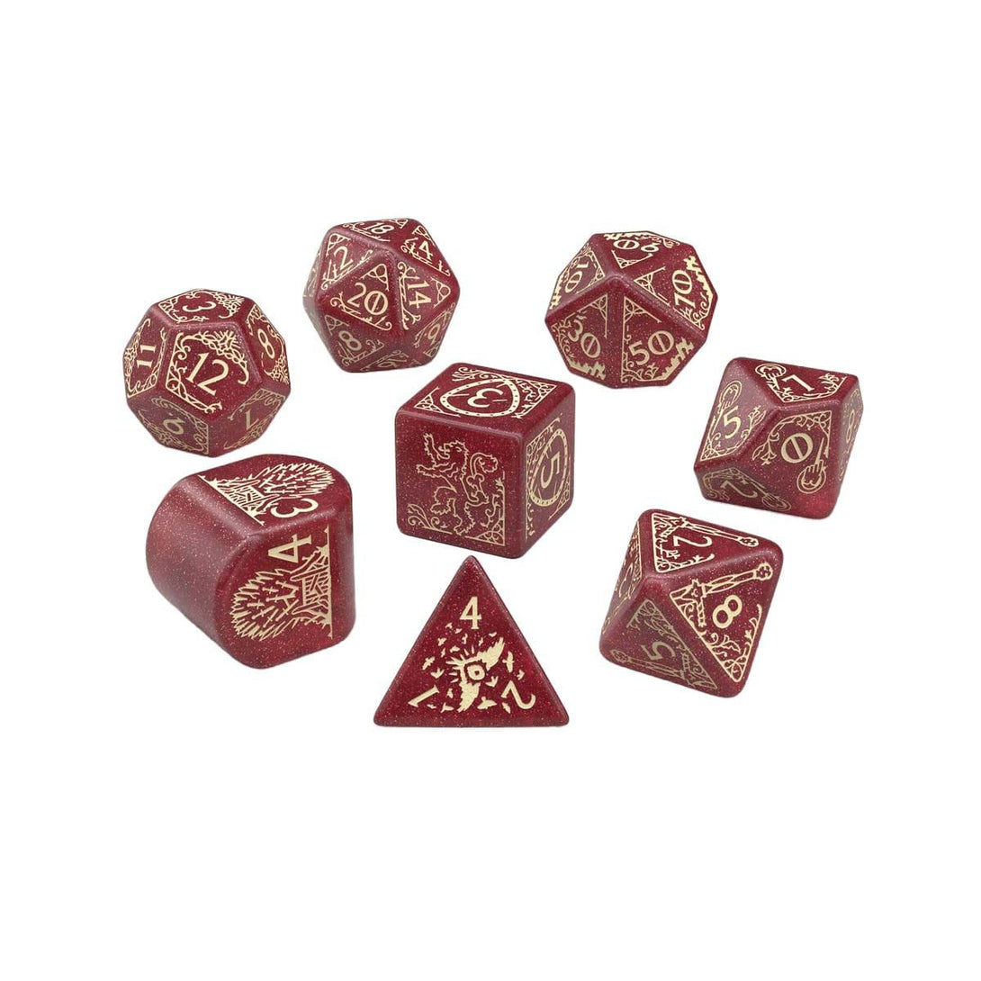 This officially licensed dice set embodies the prestige of House Lannister, with shimmering red dice and bright yellow engravings reflecting its noble banner. The design features the roaring lion sigil, the Hand of the King’s brooch, and other emblems of power and wealth. A tribute to one of the most influential houses, perfect for fans who appreciate both strategy and grandeur.