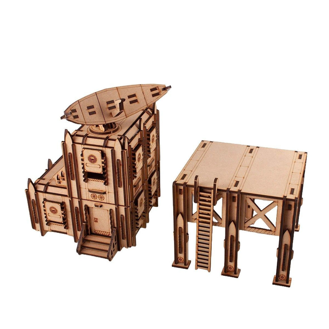 The Mecharium: Radar Pod kit has removable floors allowing you to fight across multiple levels as well as a cover to house vehicles you want to use as scenery! The platform and building have playable space on top, allowing height and verticality to any board setup.