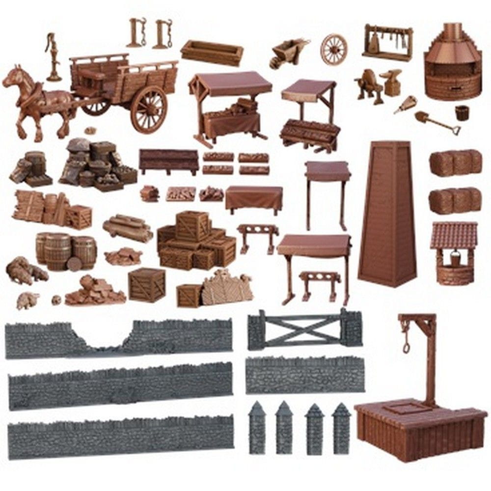Everything you need to build a sprawling marketplace at the centre of a fantasy town, this set includes market stalls, piles of stock, rats, walls, a gallows, stocks, a blacksmith's and so much more!